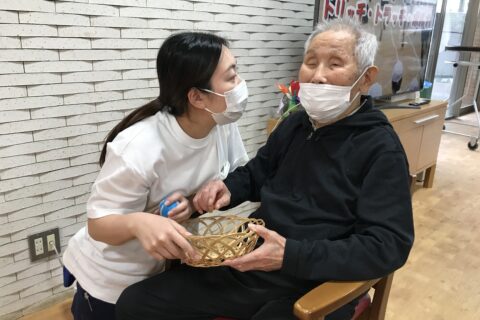 とある週末の余暇時間に、グループホーム清華苑では輪投げゲームを行いました。 木の板に書かれた数字に向かって、輪っかを投げるゲームです。 トップバッターはK様。「え~!?輪投げ!?できるかな?」とおっしゃりながらも・・・ ・・・