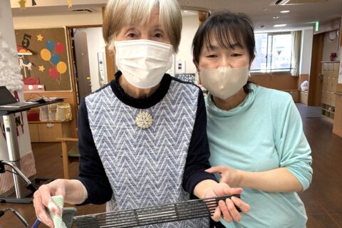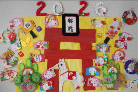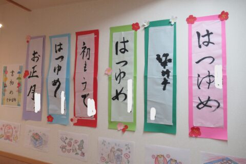 お正月といえば書き初めですね!!いつもと違う長半紙に戸惑いながらも皆様一生懸命書いておられました。 見本の文字も「お正月」「初もうで」「謹賀新年」等いろいろあり「え~どれにしようかな?これは漢字が難しいなぁ」「こっちにし・・・
