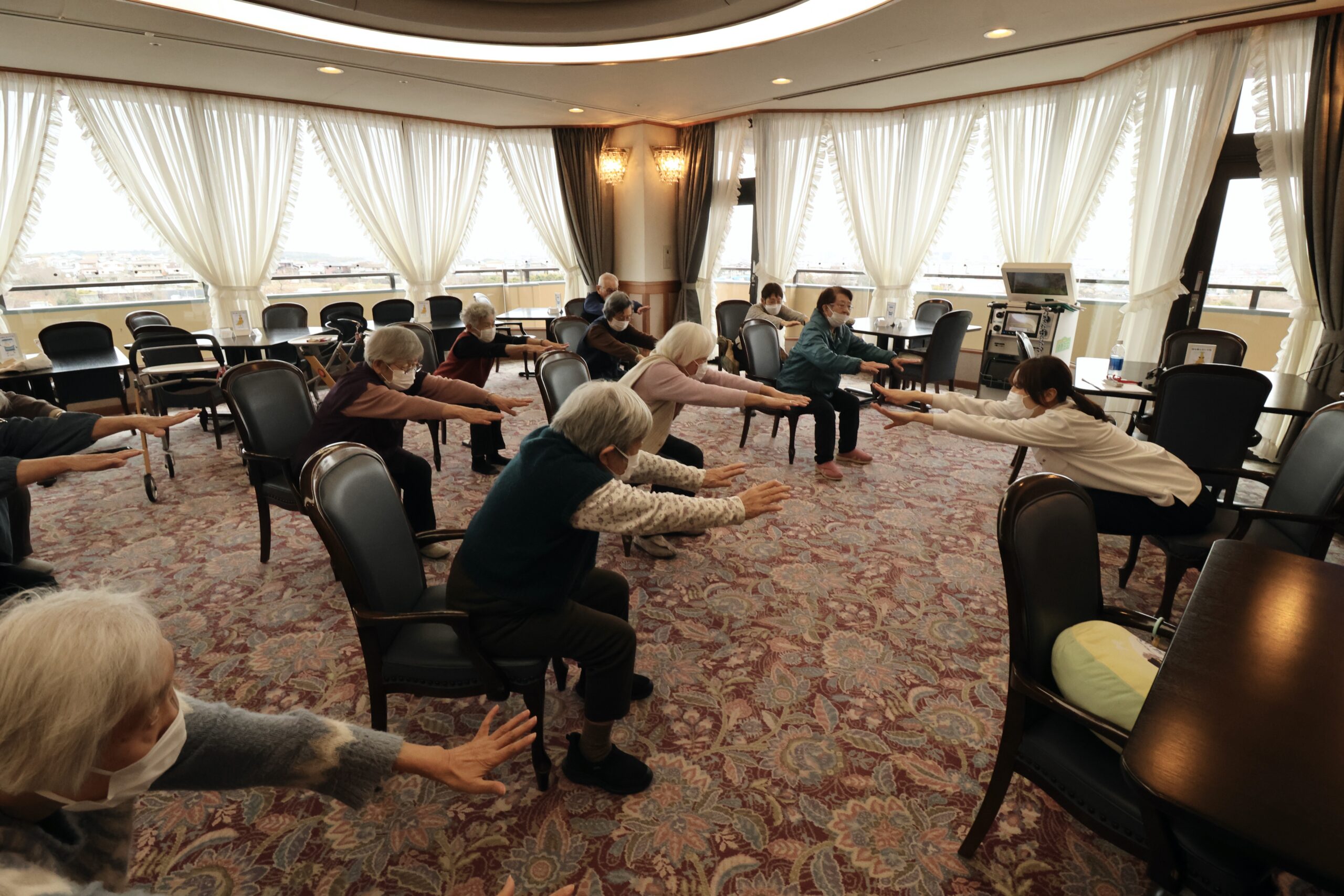 見晴らしの良い食堂で、週に1~2回体操を行っています。