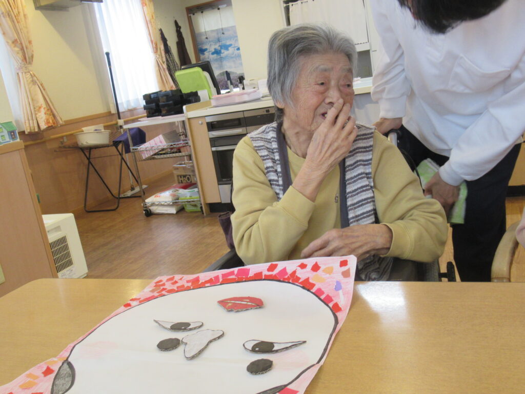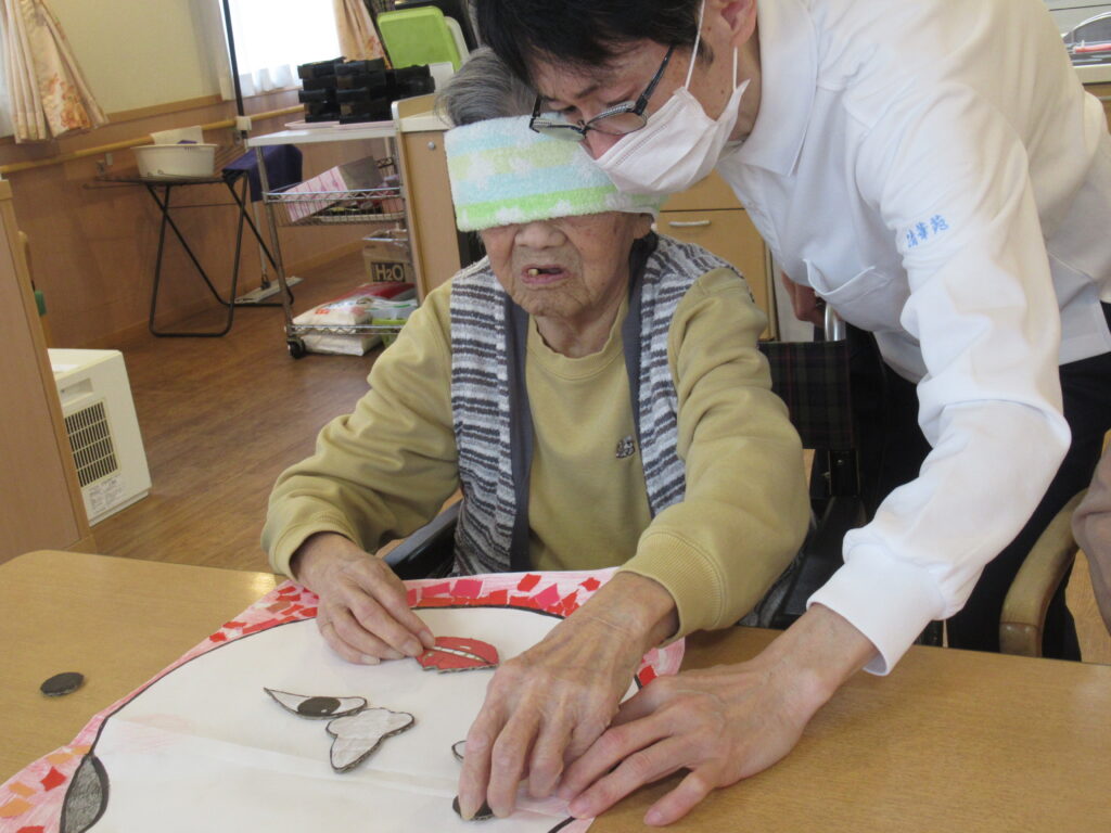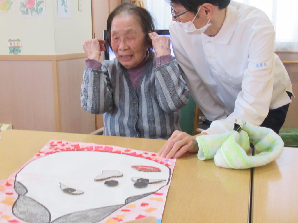 「次は鼻を置いてみましょう!」と職員が声掛けして「どこやろか」と悩んでいると、周りのご利用者から「もうちょっと右右!いや、上や!あ~それは上すぎやで!下下!」と助け船が。