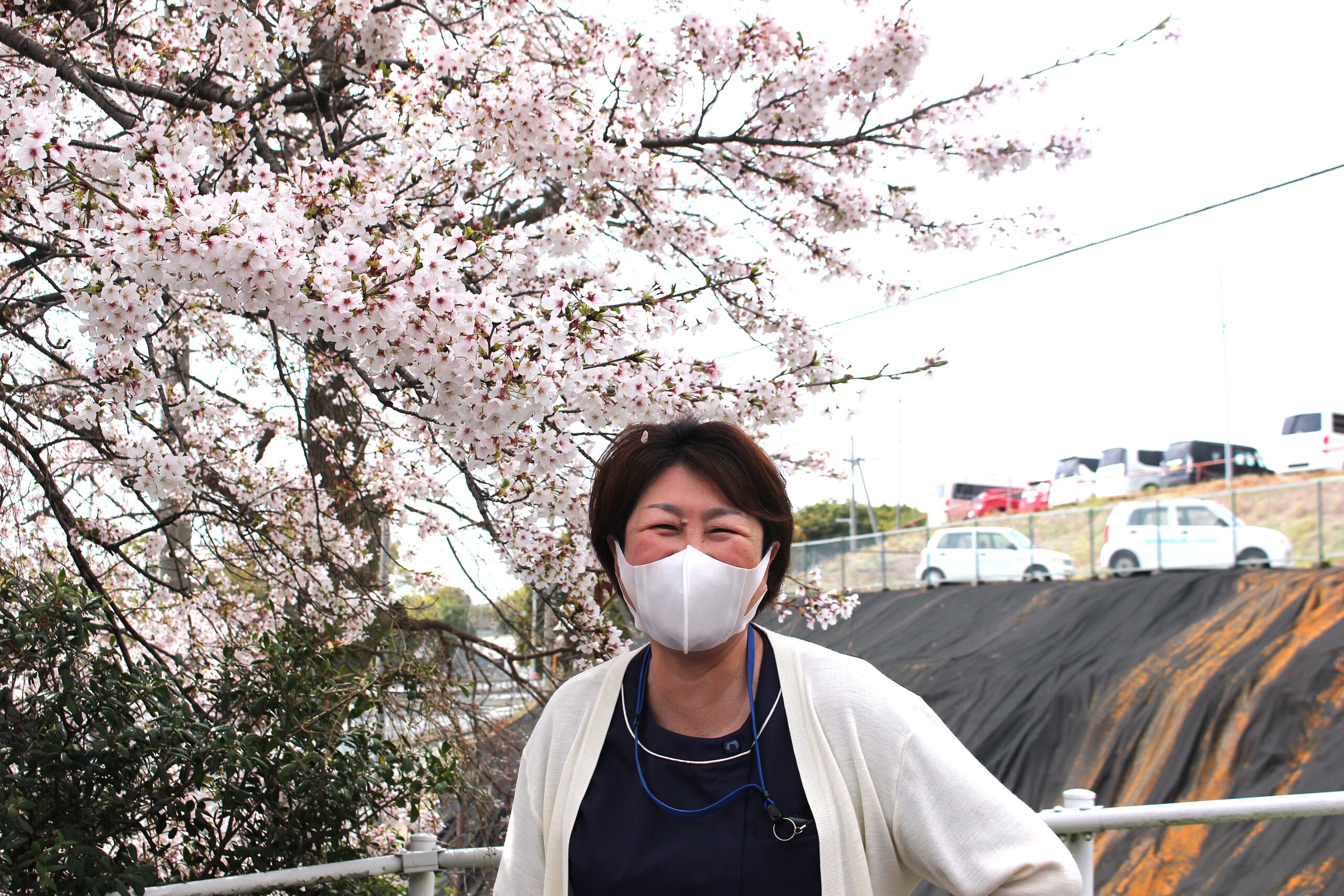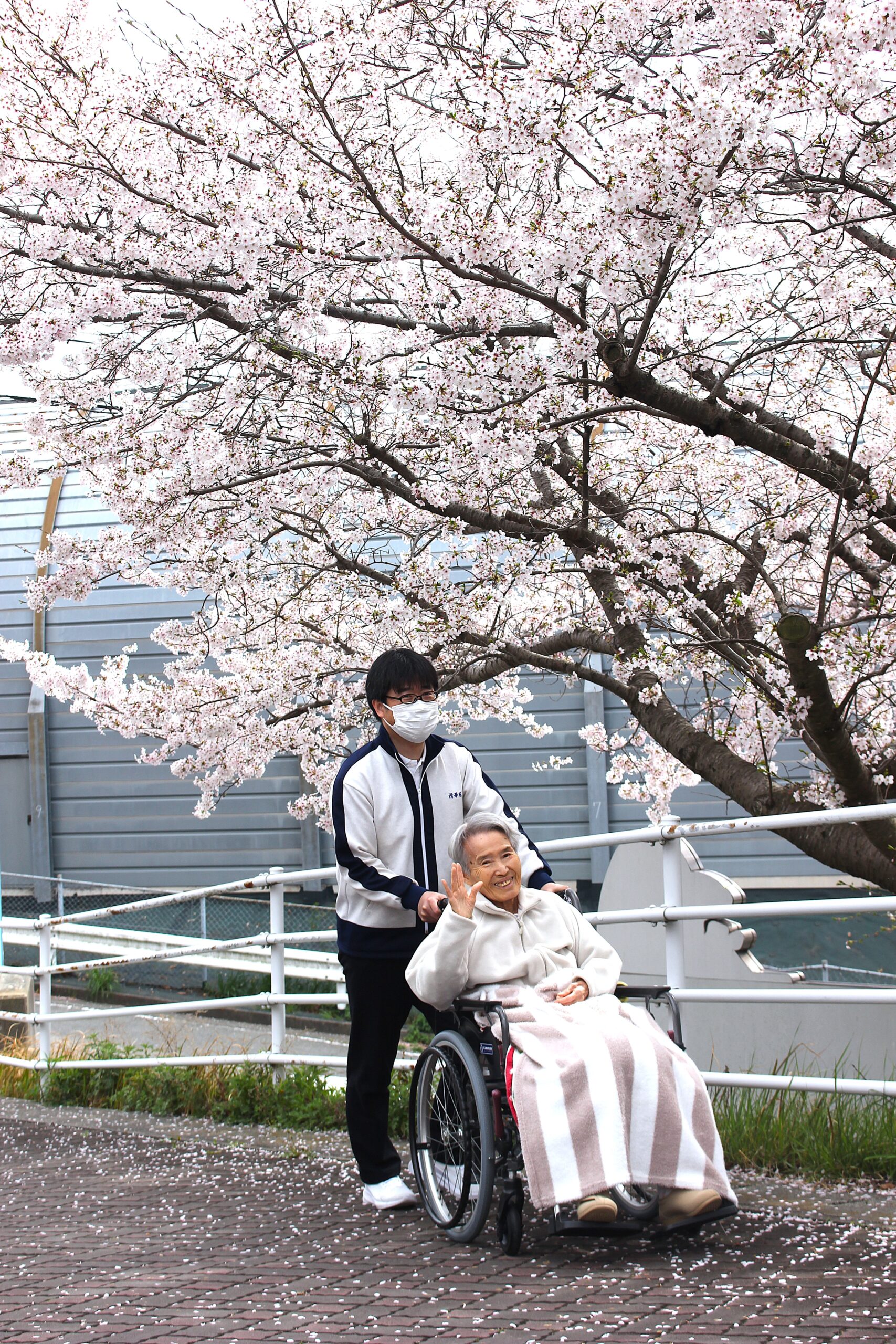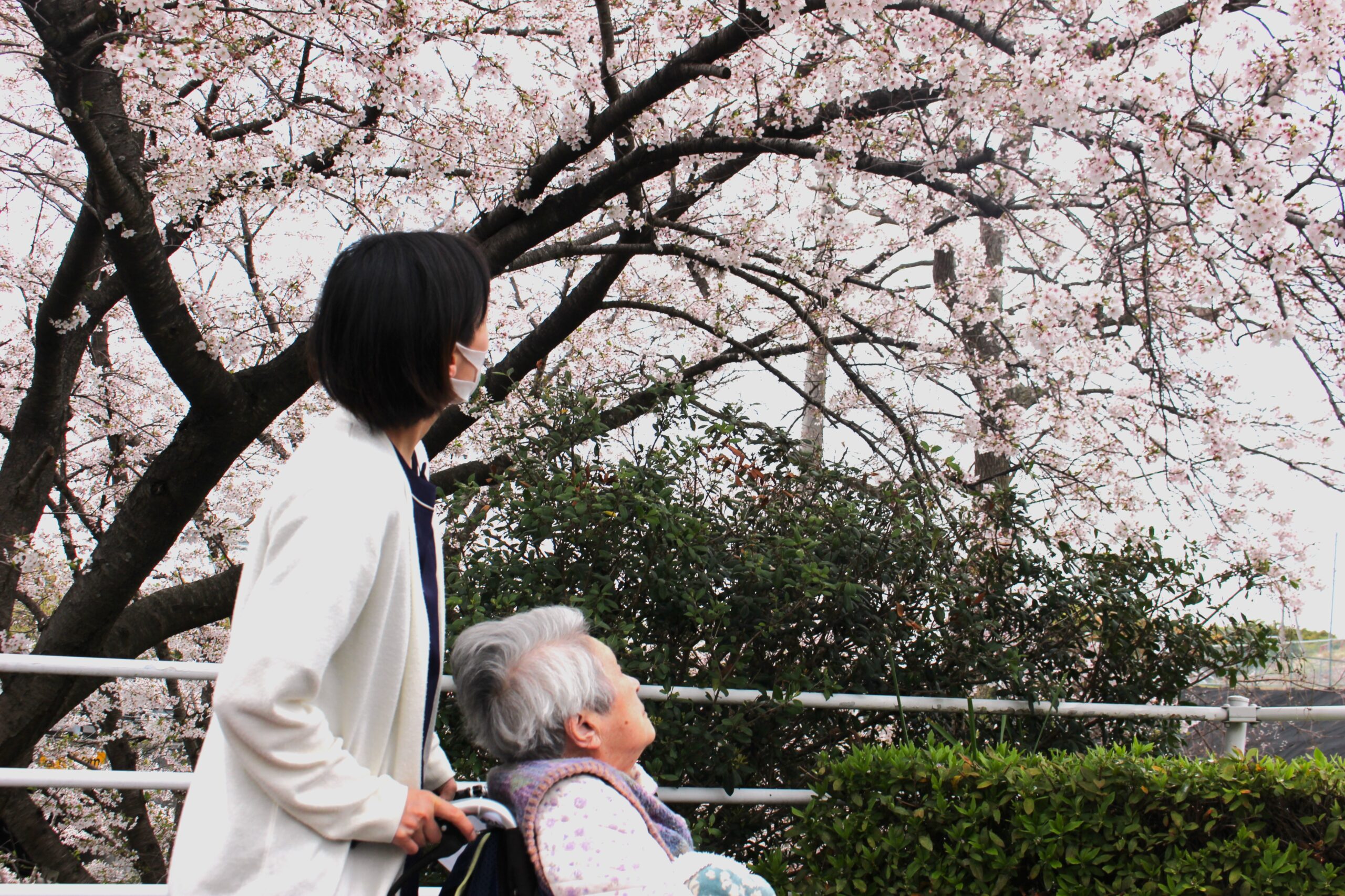施設で小さなお花見をしました。といっても、大げさなものではなく玄関を出て少し進んだ先に咲く桜を見に行く、ほんのひとときの外出です。