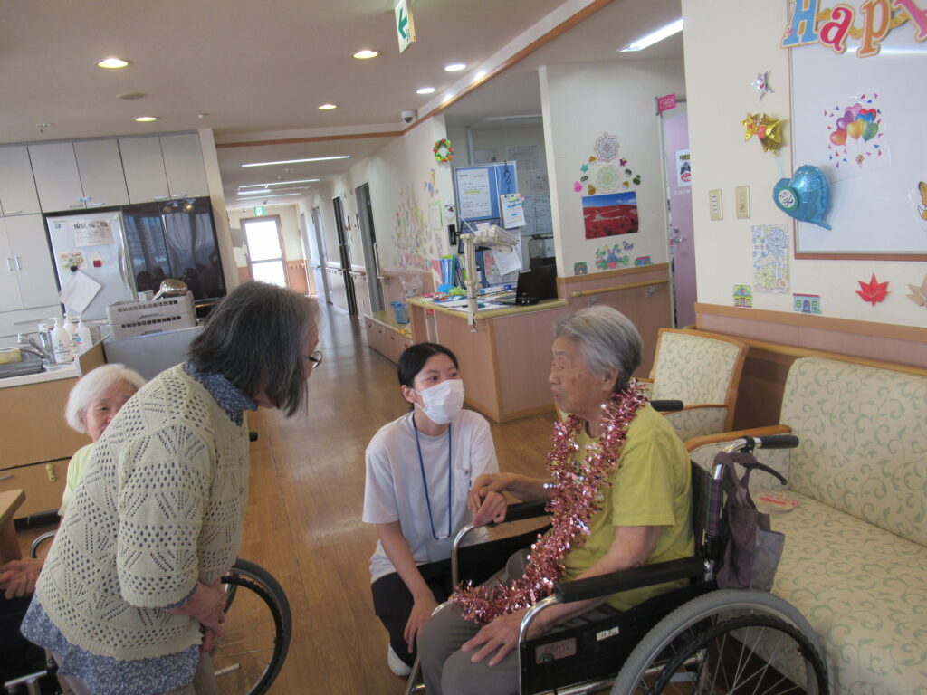 主役のN様にはキラキラ輝く飾りを付けていただき、他のご利用者様からお祝いのお言葉を一人ずつ伝えていただきました。