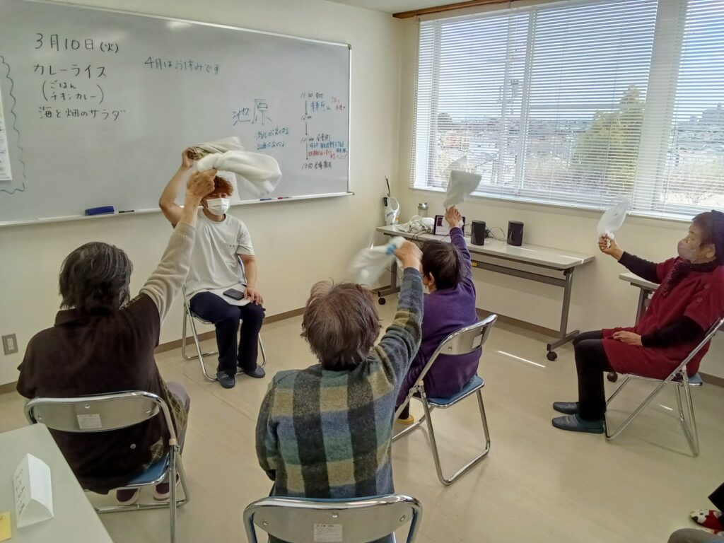 今回は初めてづくしの講座で、音楽に合わせて体を動かすタオル体操に挑戦しました。