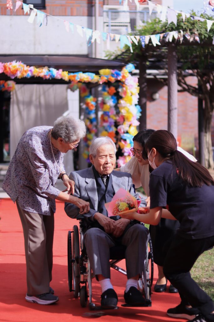 衣装選びの際は、ご家族様の「昔仕事で着ていた背広をきてほしい」と言う思いと、実際にO様が背広を着用されその際にとてもいい笑顔をされたことから、その背広をリメイクすることとなりました。 シニアファションショー当日、奥様と職員と主にランウェイを歩かれました。