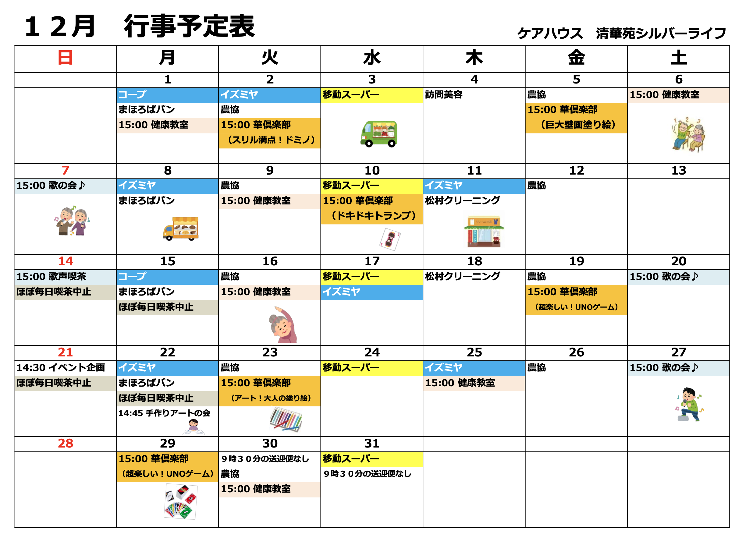 少し遅くなってしまいましたが、ケアハウスの12月の行事予定表です。