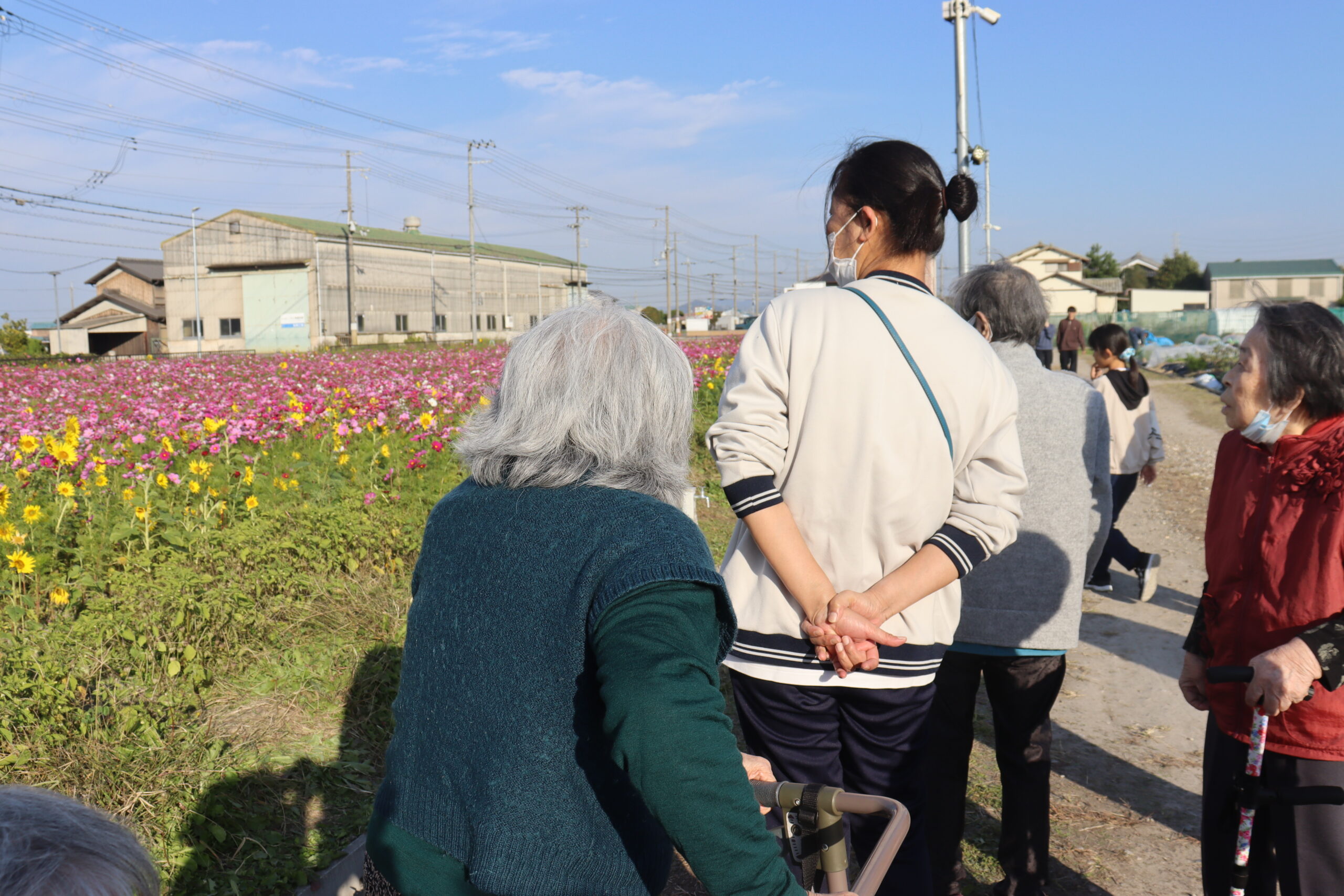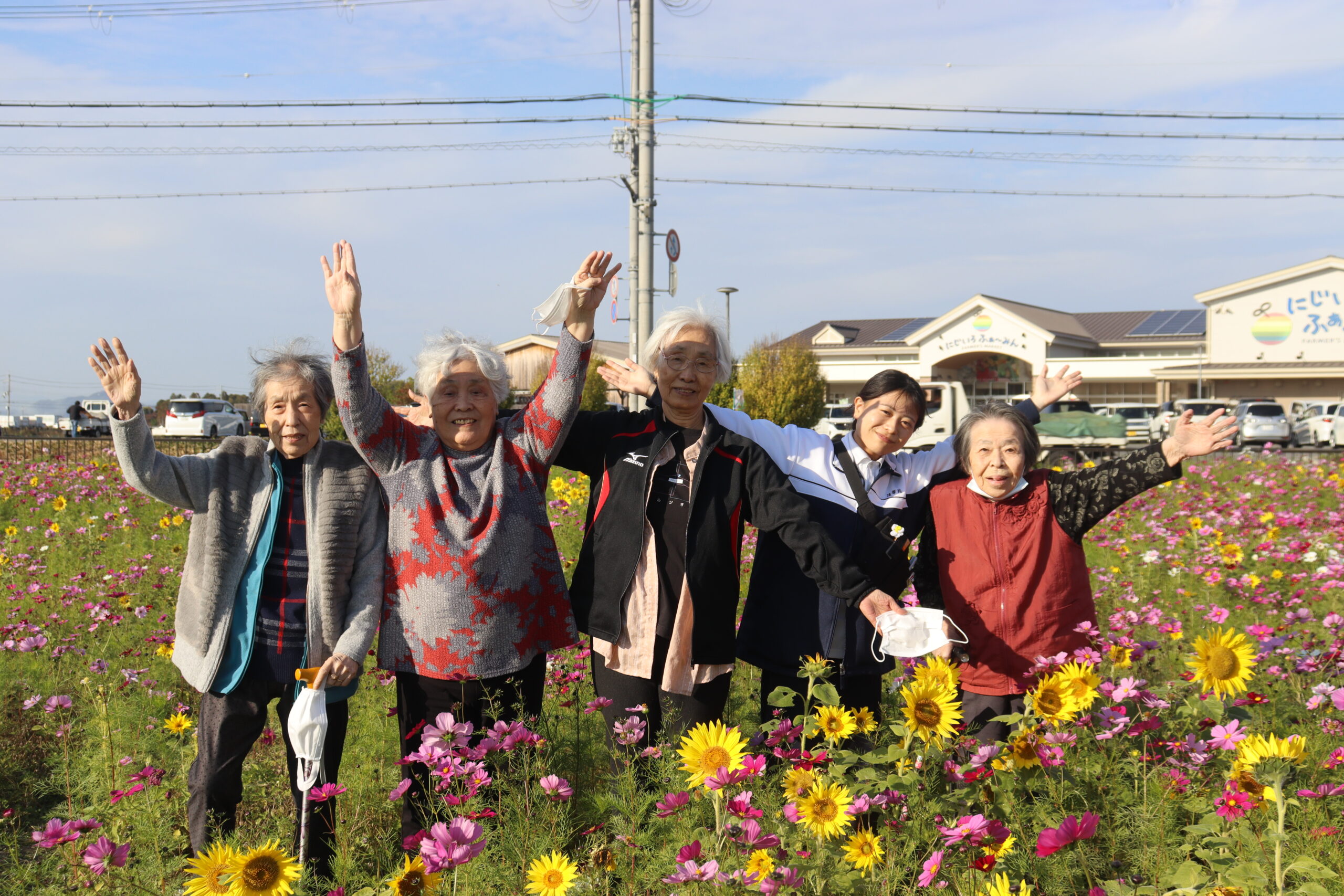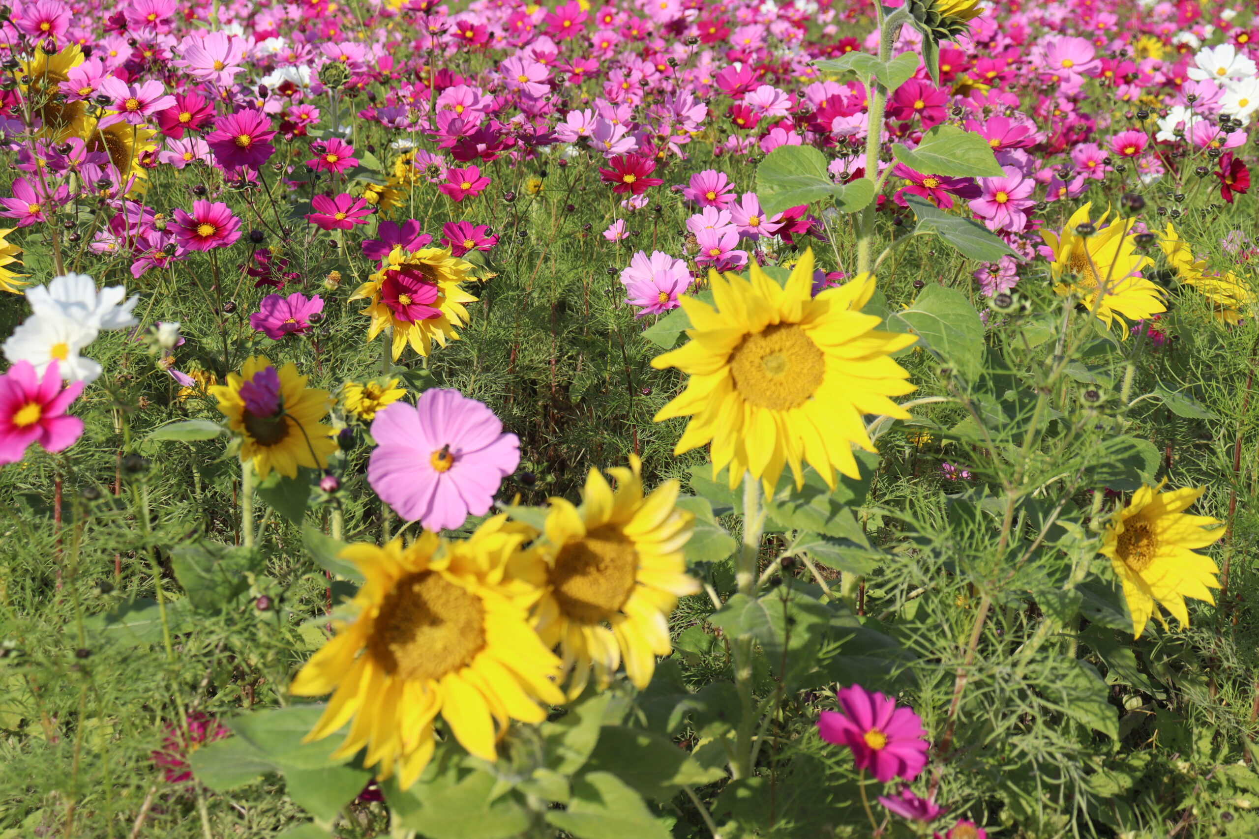 稲美町のコスモス畑に。ひまわりも咲いていました。ひまわりといえば夏のイメージですが、コスモスの中に差し色として存在感がありました。