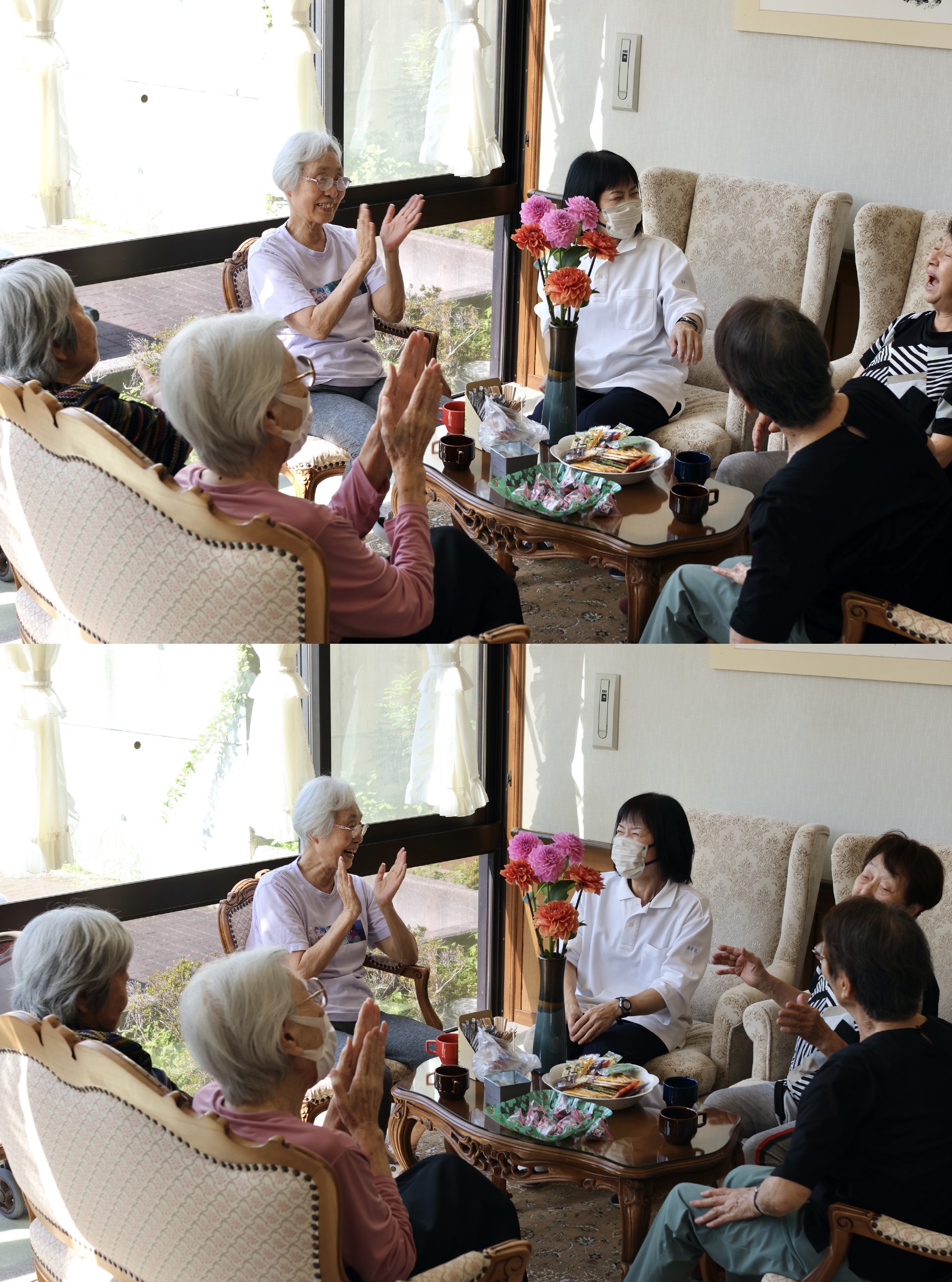 ダリアを囲んで🎵 2025年9月19日 9月19日(金) 午後のひととき。 綺麗なダリアの花を囲んでお話しにも花が咲いていました。 こんな感じでほぼ毎日喫茶はワイワイと盛り上がっています。 さあ、明日はどんな1日になるでしょうか。 (ケアハウス 清華苑シルバーライフ T.M)
