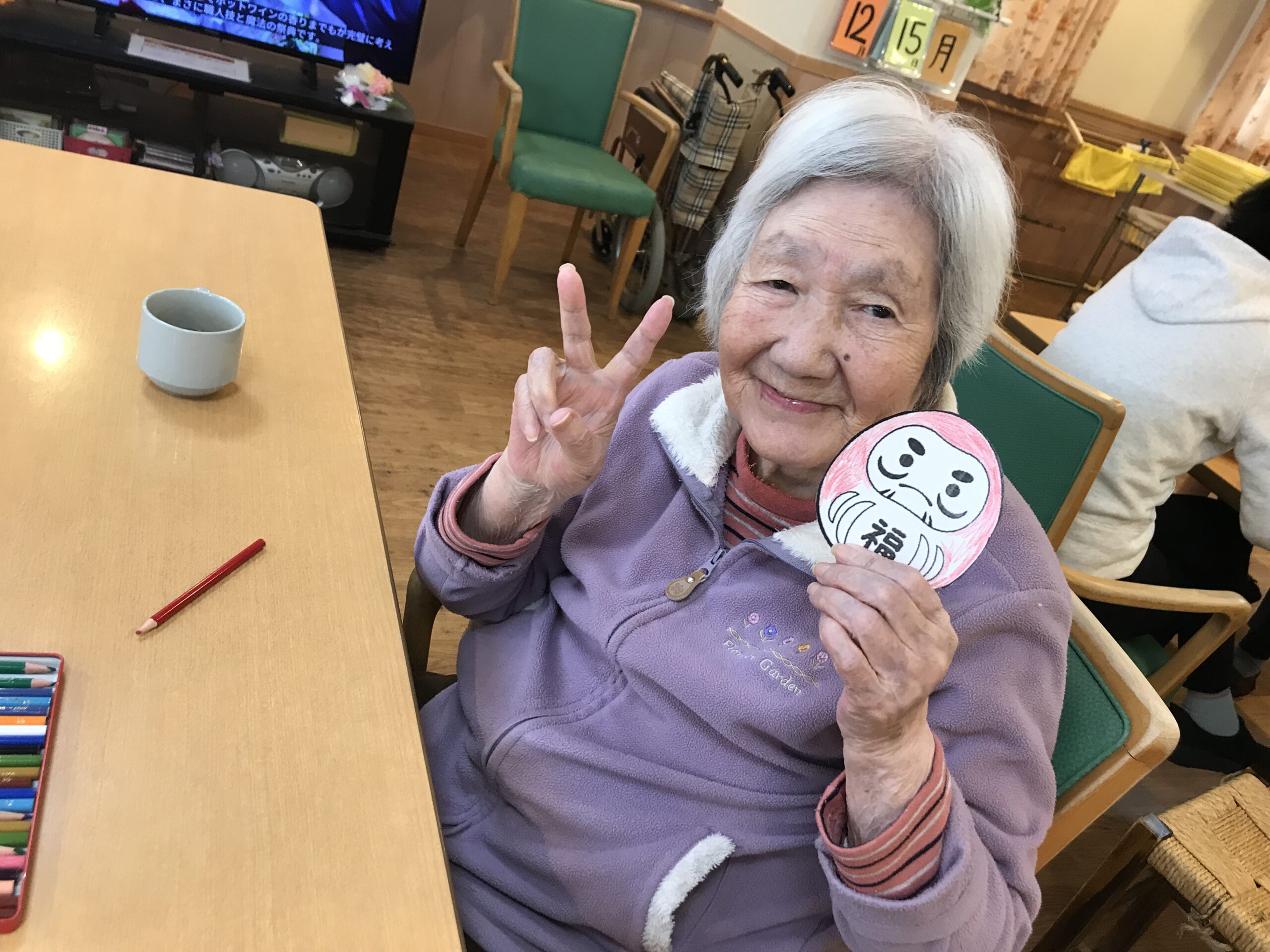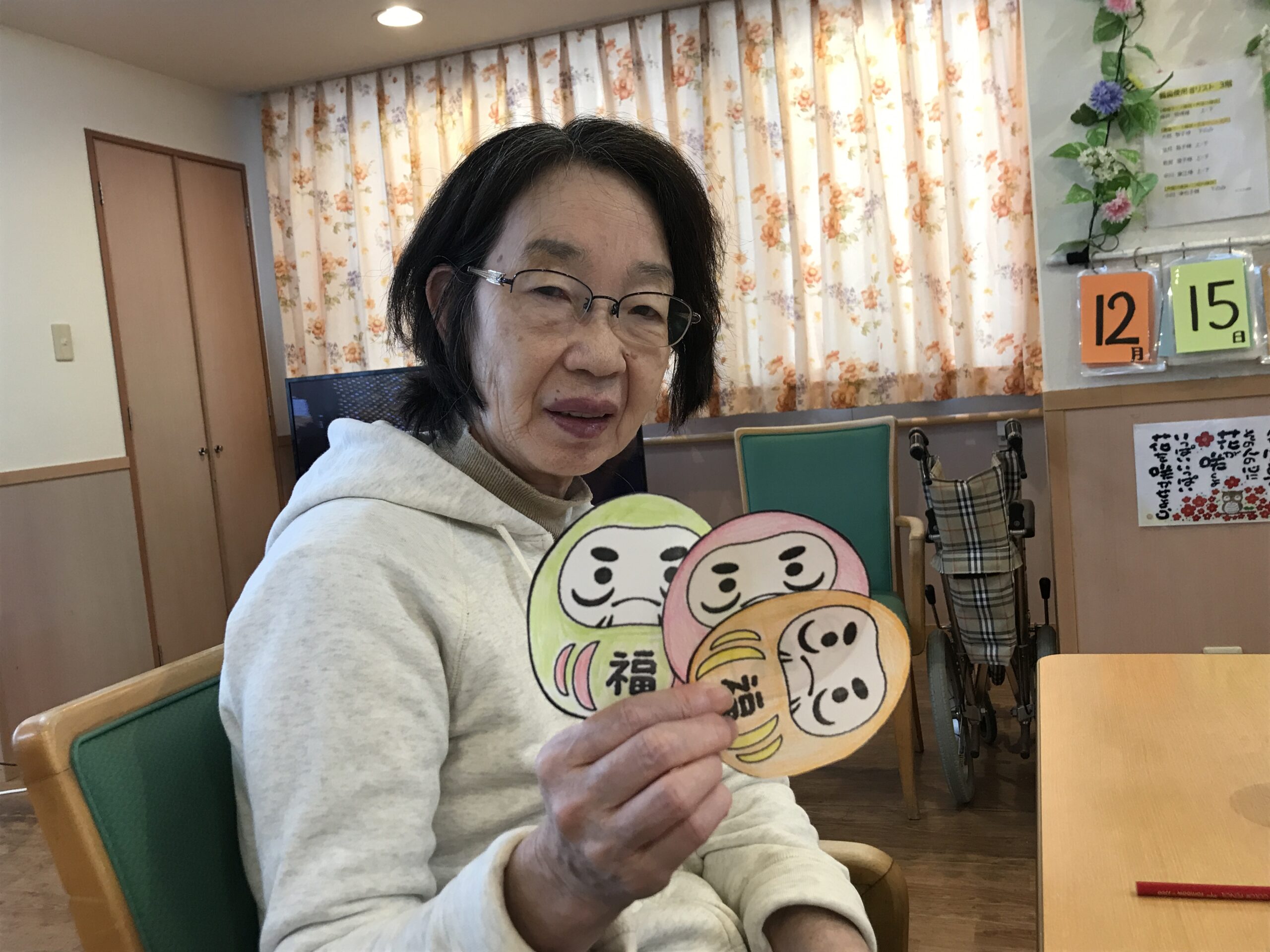 なんと、だるま、絵馬、梅の花の塗り絵は全てご利用者が塗ってくださっているんです!