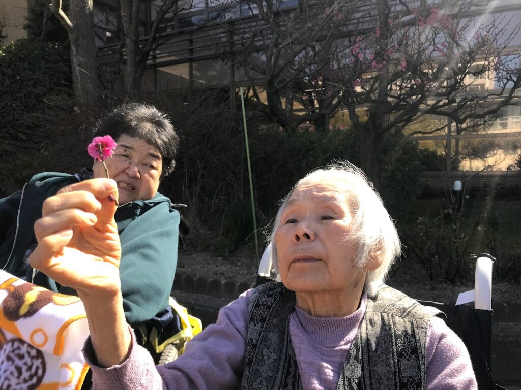 寒さが少し和らいだ日に、久々に皆さんで中庭に散歩へ😊