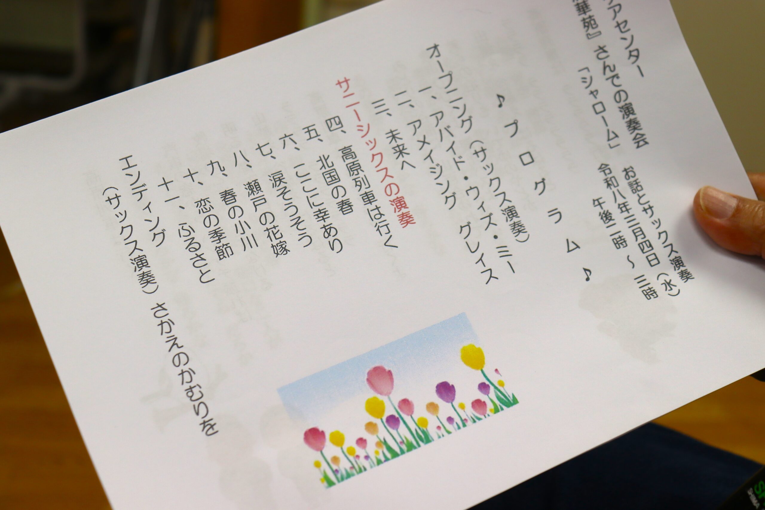 「シャロームとサニーシックス」さんにご来苑いただきサックスとフルートの生演奏をしていただきました。なんとも贅沢な一時間!!
