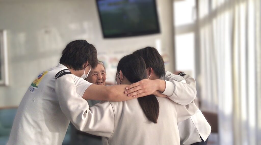 ある日曜日、職員がAさんを囲んで「みんなで一緒にいきたいですね」、「誰が運転しますか」などと話をしていると、Aさんが「みんなで行こか!」と両手を広げて職員の肩に腕を回して輪になり円陣を組んでくださいました。