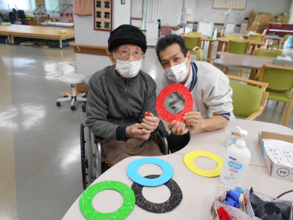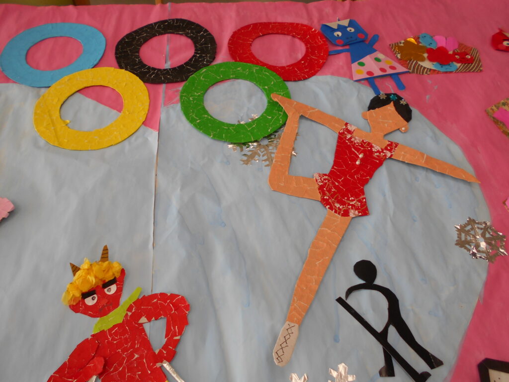 オリンピックの五輪は5色で色鮮やかに貼り絵をしました。