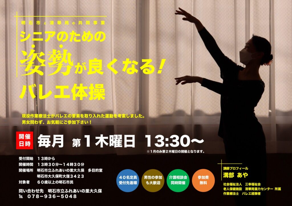 兵庫県認定地域サポート施設事業の一環として、明石市と共同で「姿勢が良くなるバレエ体操」を開催しています。