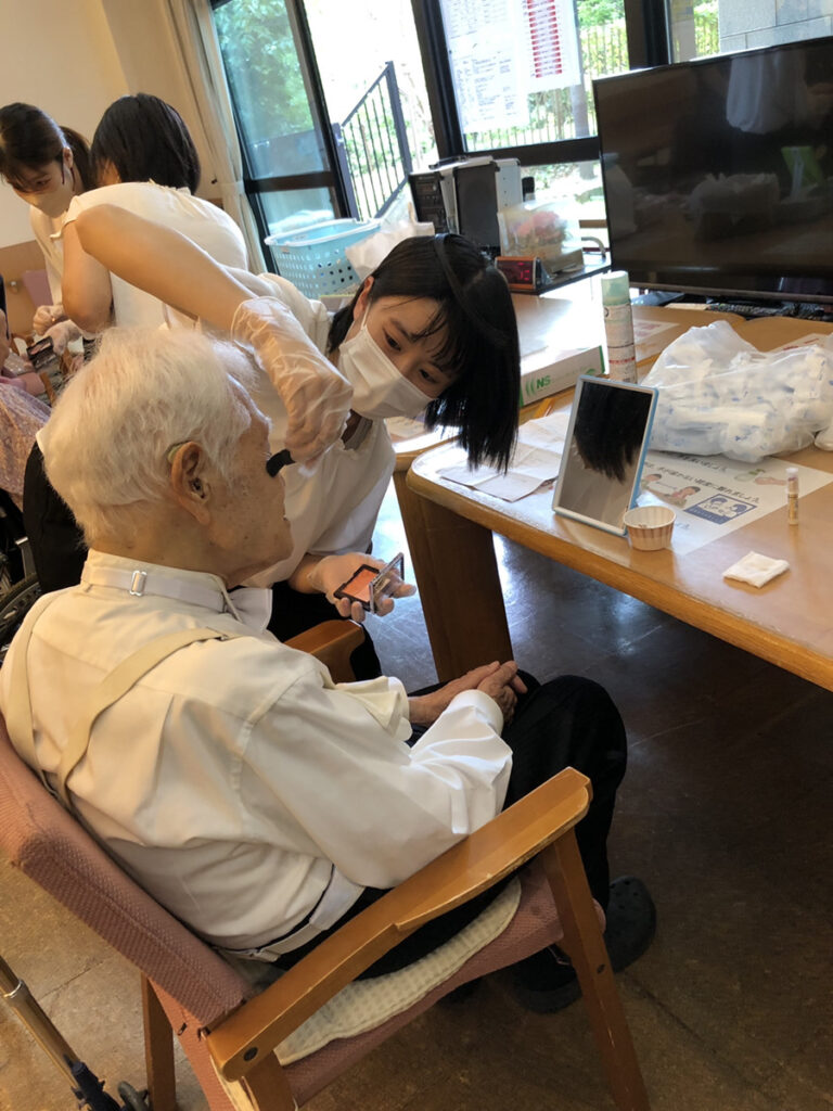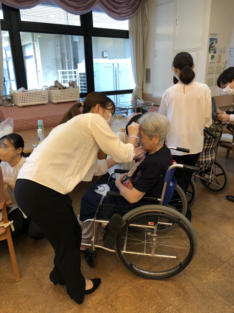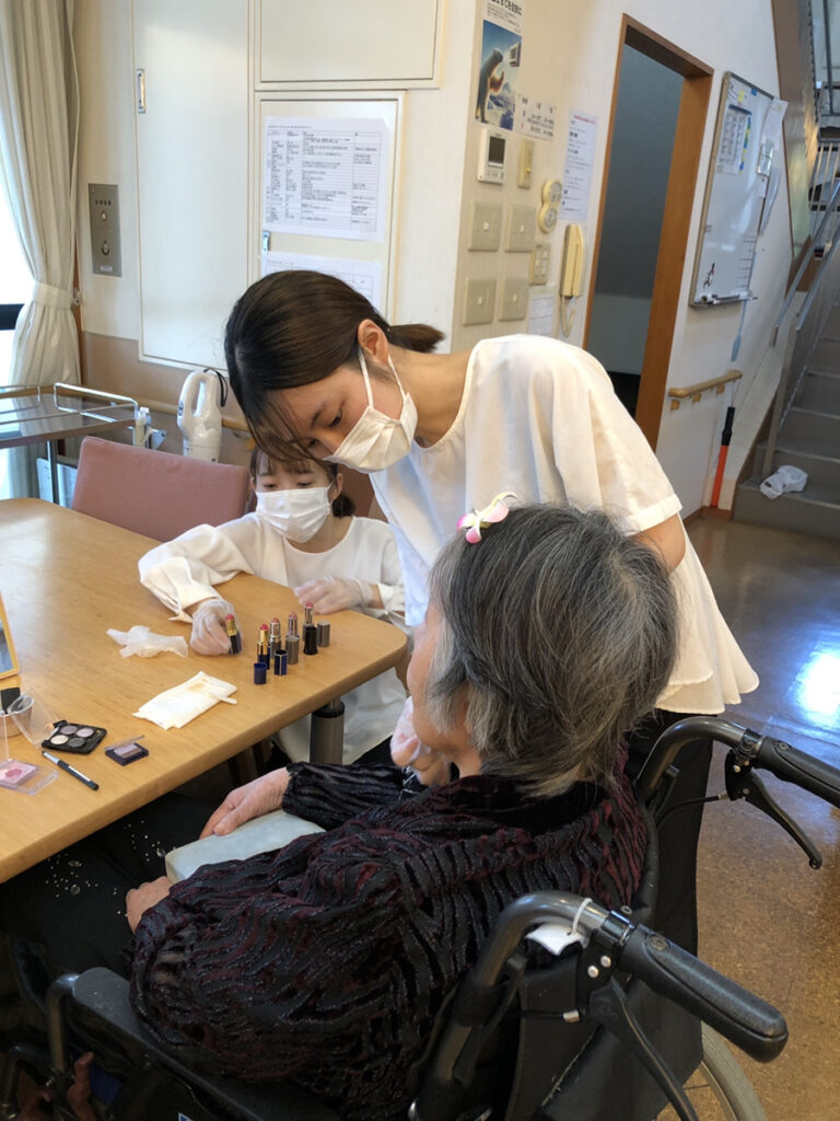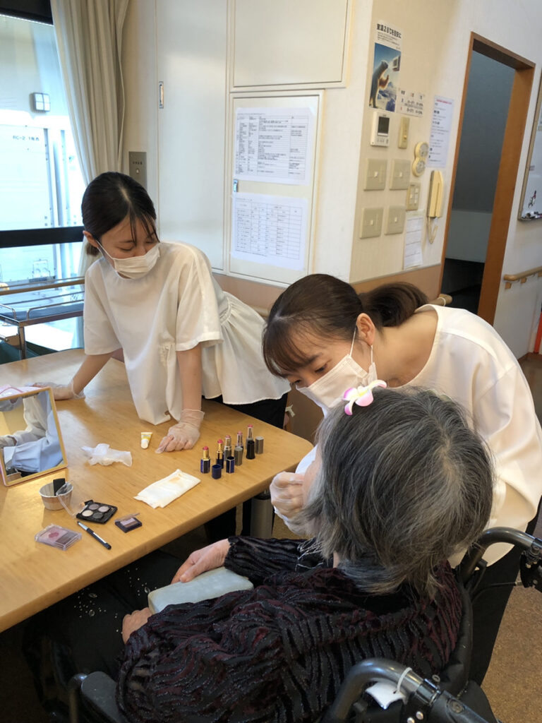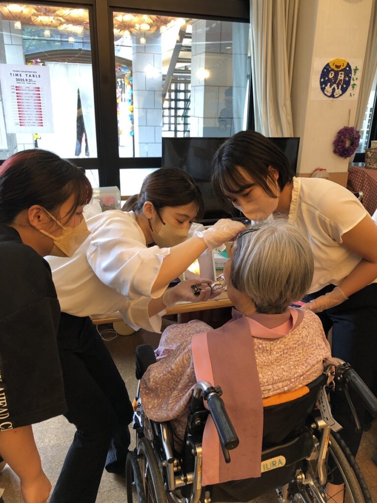 中でも特に大切なのがメイク。 衣装だけでなく、表情まで輝かせる魔法をかけてくれたのは、法人内の介護スタッフたちです💄