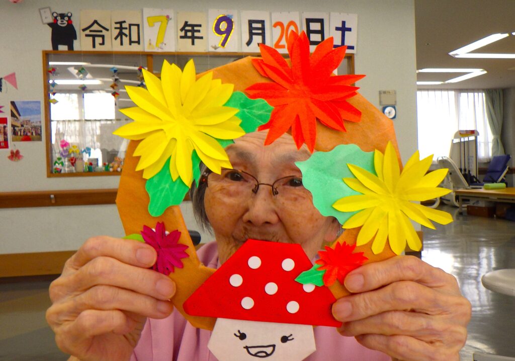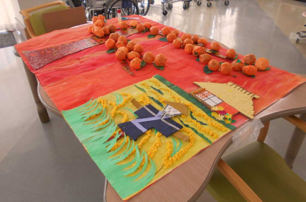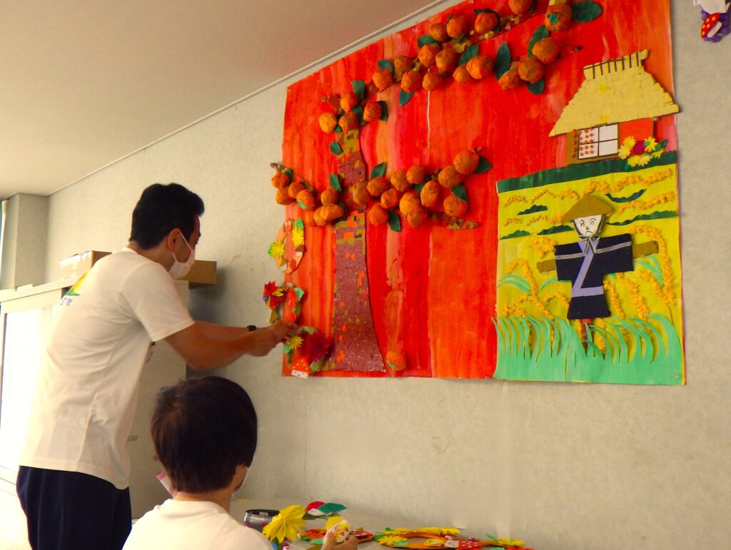 菊の花や表情豊かなカボチャを折り紙で作成しました。