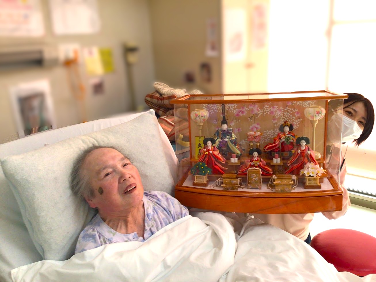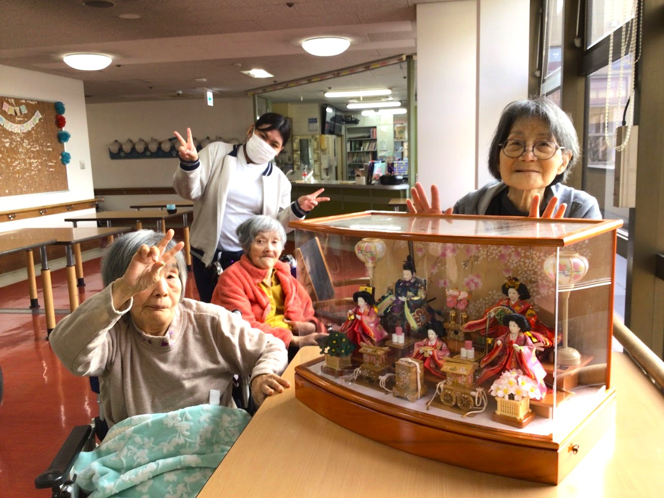 皆さん懐かしいひな人形に釘付け。一目見て頂こうと、居室まで雛飾りを運びました✨