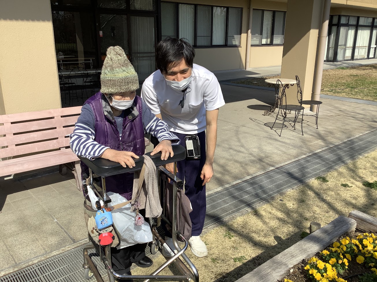先日、中庭にある「養力ガーデン」へご利用者様と一緒に散歩をしました。