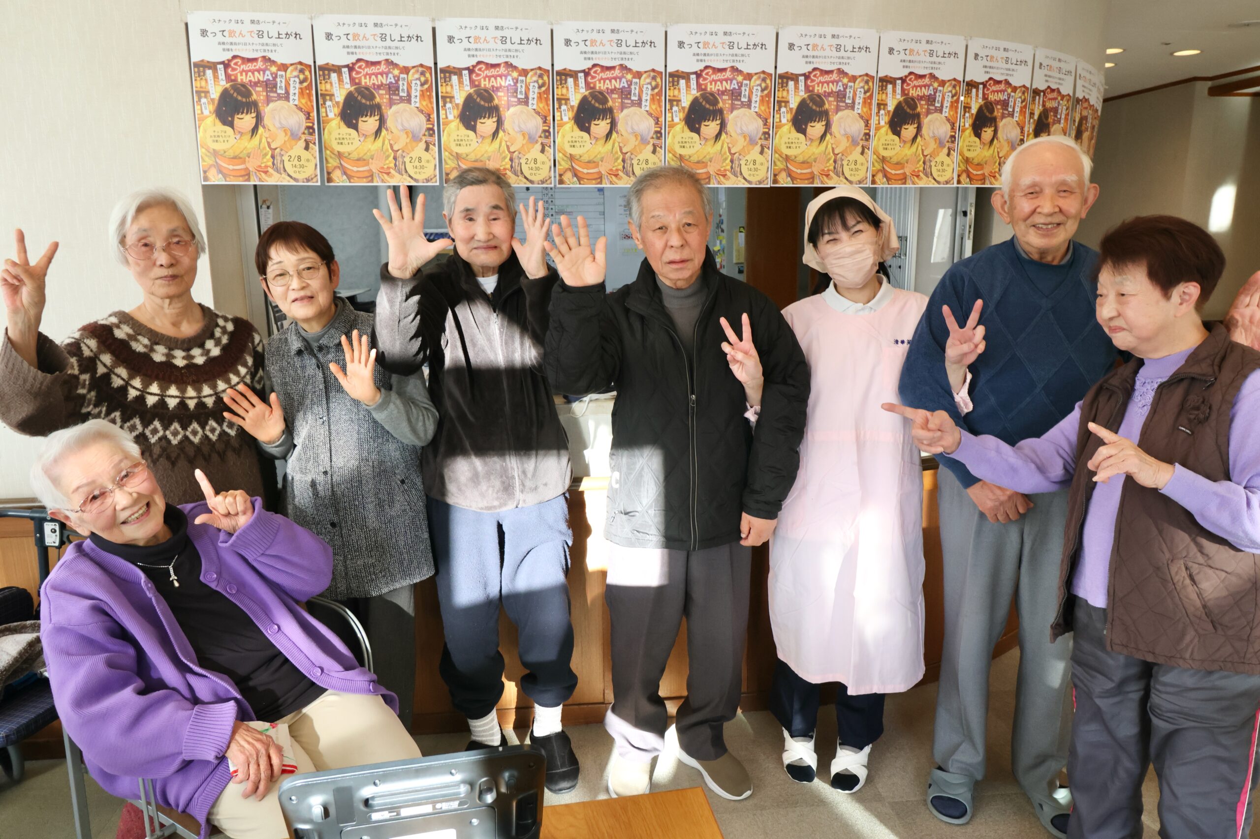そんな寒い日でしたが、ケアハウスではマンスリーイベントとして「スナックはな開店パーティー」を開催して盛り上がりました!