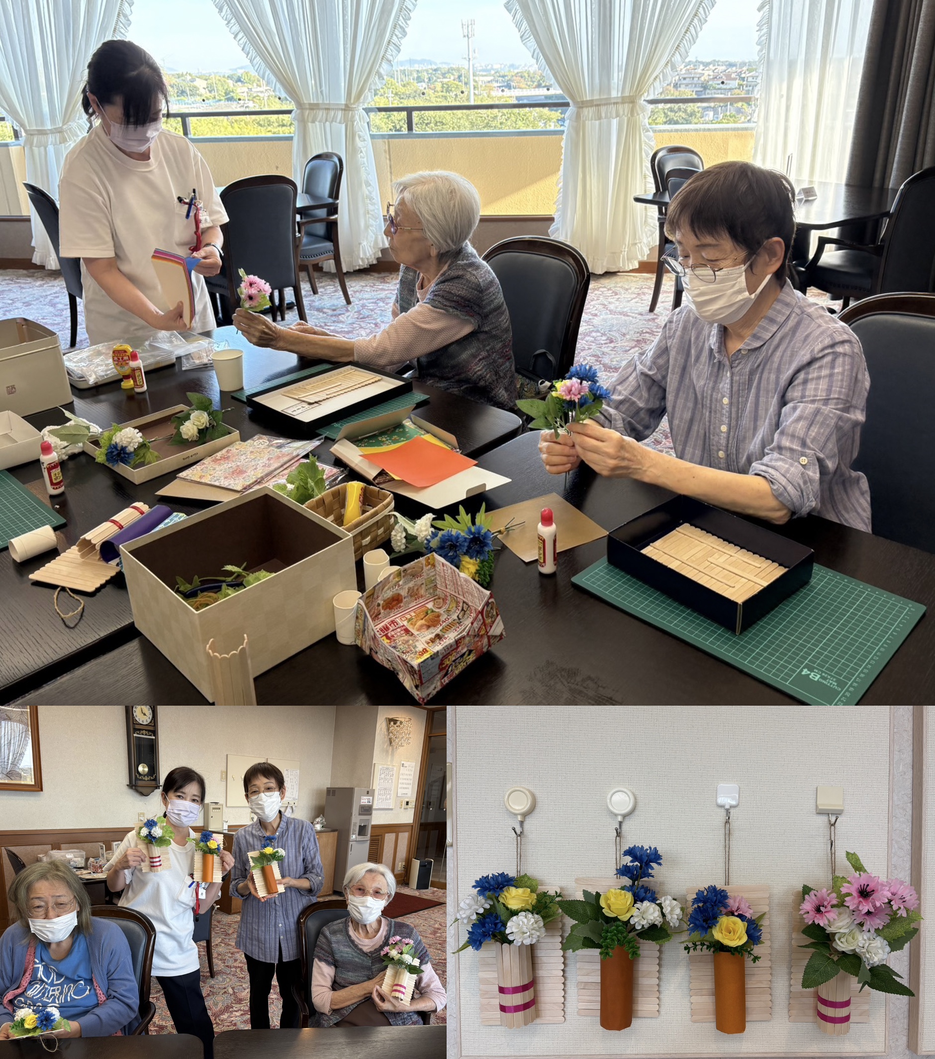 10月の手作りアートの会では、木製スティックとトイレットペーパーという身近な素材を使って、気軽に楽しめる作品を制作しました。