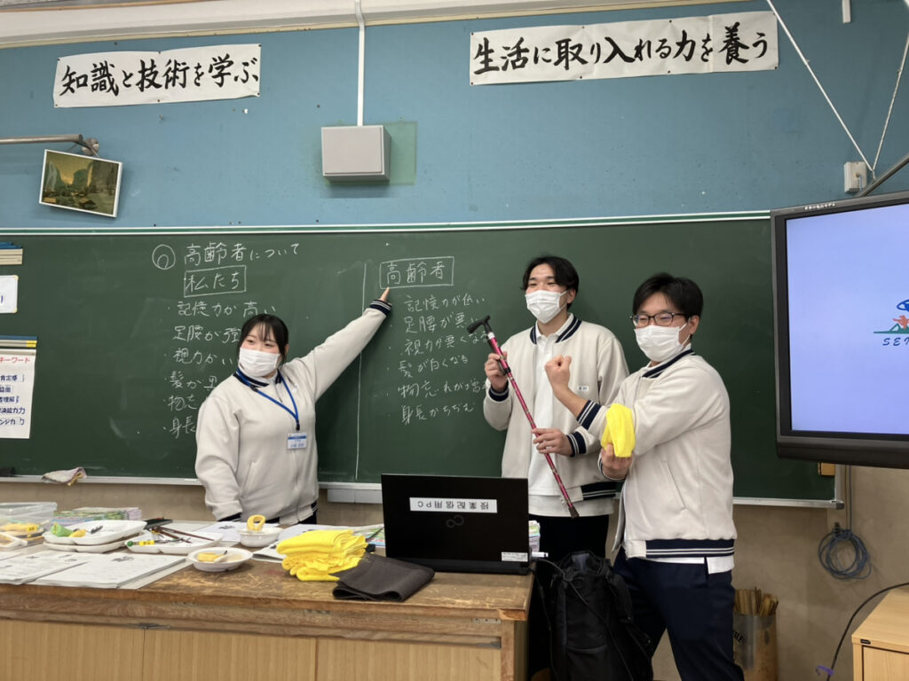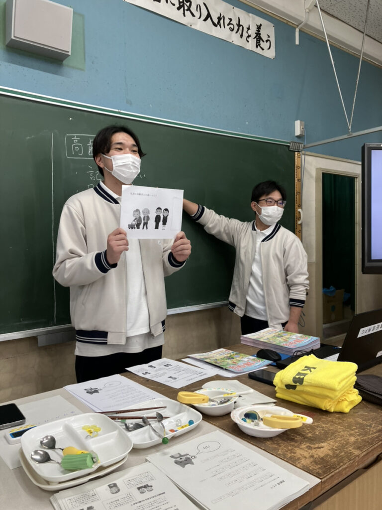 授業では、高齢者と若者の身体の違い、高齢になることで生じる不自由さ、そして介護保険制度や福祉用具などについて学んでもらいました。