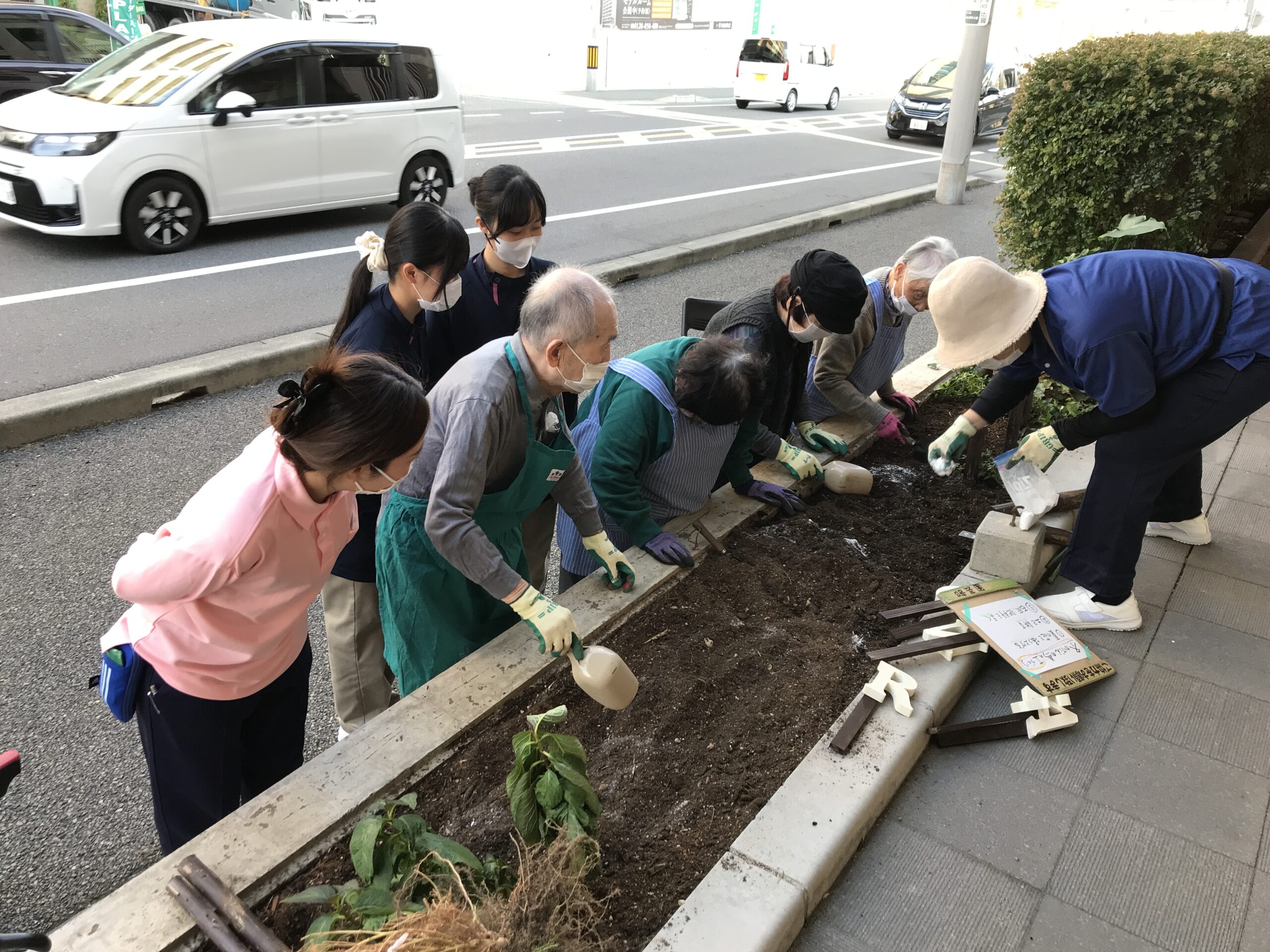 園芸レクの先生と一緒に、まずは花壇の土を耕すことから始めました!