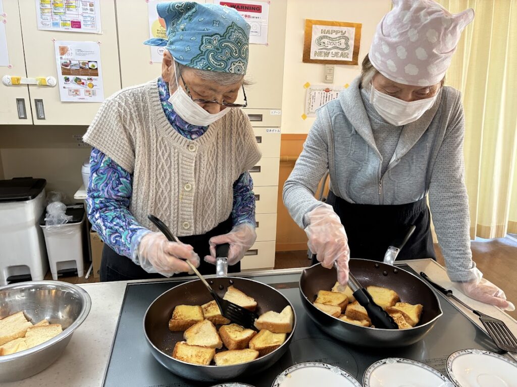 カットした食パンを液に浸してから焼いていきます🍳