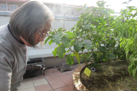 グループホーム清華苑の4階には、屋上庭園があります。 季節に合わせた花々や野菜の成長を見にいく散歩は、ご利用者や職員の楽しみの一つ。 「天気もいい日ですし、お散歩に行きましょうか?」とお声がけすると、「散歩!?あの野菜は・・・