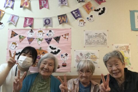 グループホーム清華苑では、10月からフロアの壁がハロウィン仕様となりました! 飾られている素敵な塗り絵はご利用者が塗ってくださっています😊🎵 「帽子の色は何がいいかな?」「あ、可愛くなった・・・