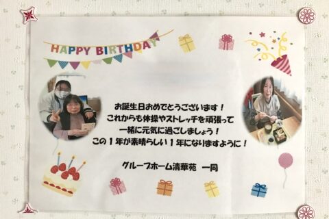 この前年始の行事をしたはずなのに、もう1月も下旬になりましたね☺ さて今回は、今月上旬に開催した誕生日会の様子をお届けしたいと思います🎂 普段は物静かに過ごされているI様。記念撮影の際、最初・・・